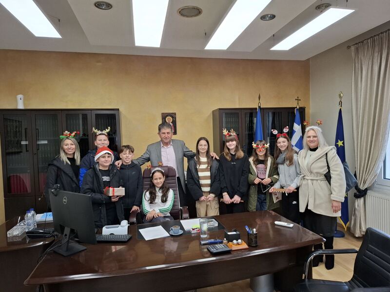 Ο Δήμαρχος καλωσόρισε τα παιδιά και τους δασκάλους τους, τους ευχήθηκε Καλές Γιορτές και τους ευχαρίστησε προσφέροντας τους διάφορα γλυκά.