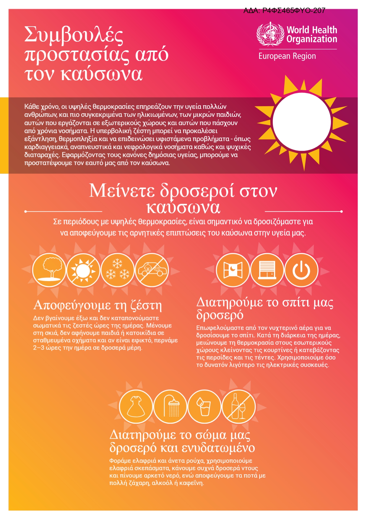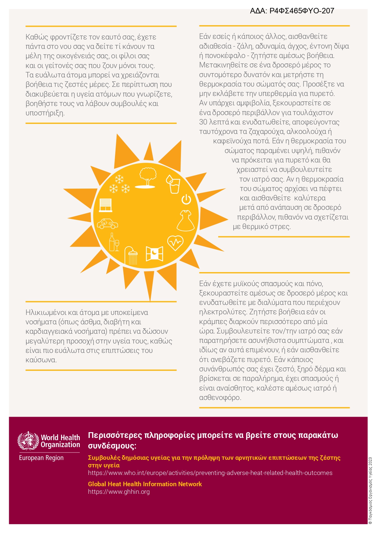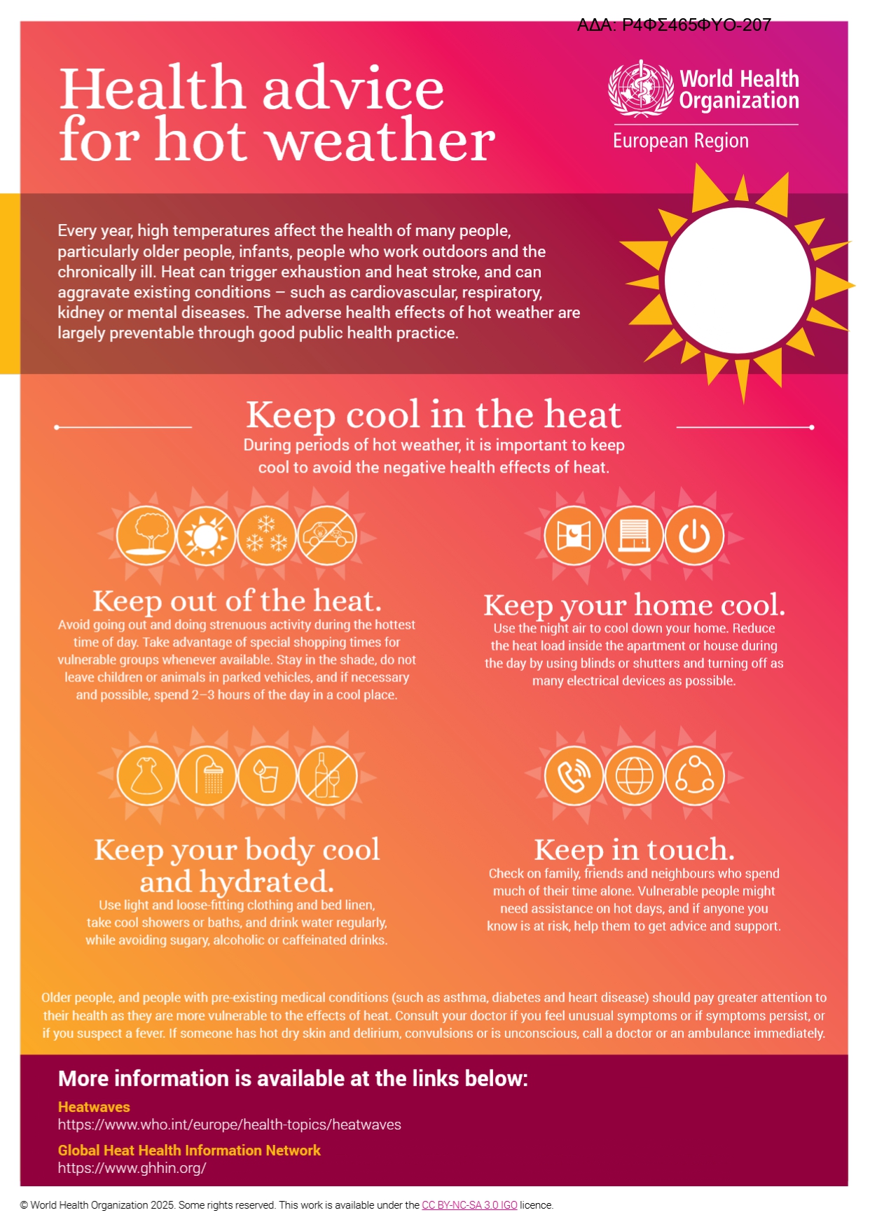 Στο πλαίσιο αυτό προκειμένου να αποτραπεί η έκθεση άστεγων ή άλλων ευπαθών ομάδων του πληθυσμού σε κίνδυνο εξαιτίας του καύσωνα, όταν επικρατούν ιδιαίτερα υψηλές θερμοκρασίες, καλεί τους δημότες που εντοπίζουν άτομα αυτών των ομάδων να ενημερώνουν σχετικά το Τμήμα Κοινωνικής Πολιτικής και Πρόνοιας του Δήμου Ηράκλειας, στα τηλέφωνα 2325028321 & 2325028314 (07:00 – 15:00) και 6947263239 (Αντιδήμαρχος κ. Νεολιαντζής Αναστάσιος).